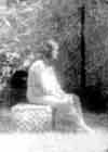 young woman dressed in white sitting on a tombstone.